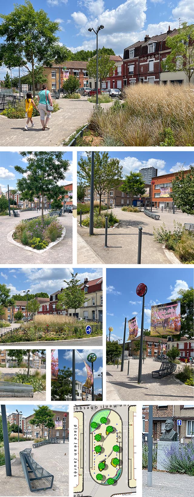 La réhabilitation de l’avenue de la République, fortement dégradée, rime avec la reconquête des éléments emblématiques de l’axe : parvis de l’Hôtel de Ville, avenue, mais aussi la place Jean Jaurès. Traitée en espace paysager accueillant et verdoyant grâce à un travail sur les limites (garde-corps, haies basses), sur les plantations d’arbres et sur une recherche de mobilier : bancs, mats signaux animés, socle pour le buste de Jaurès… cet espace jusqu’ici vécu comme un rond-point devient un véritable lieu de détente et d’agrément à l’échelle du quartier.