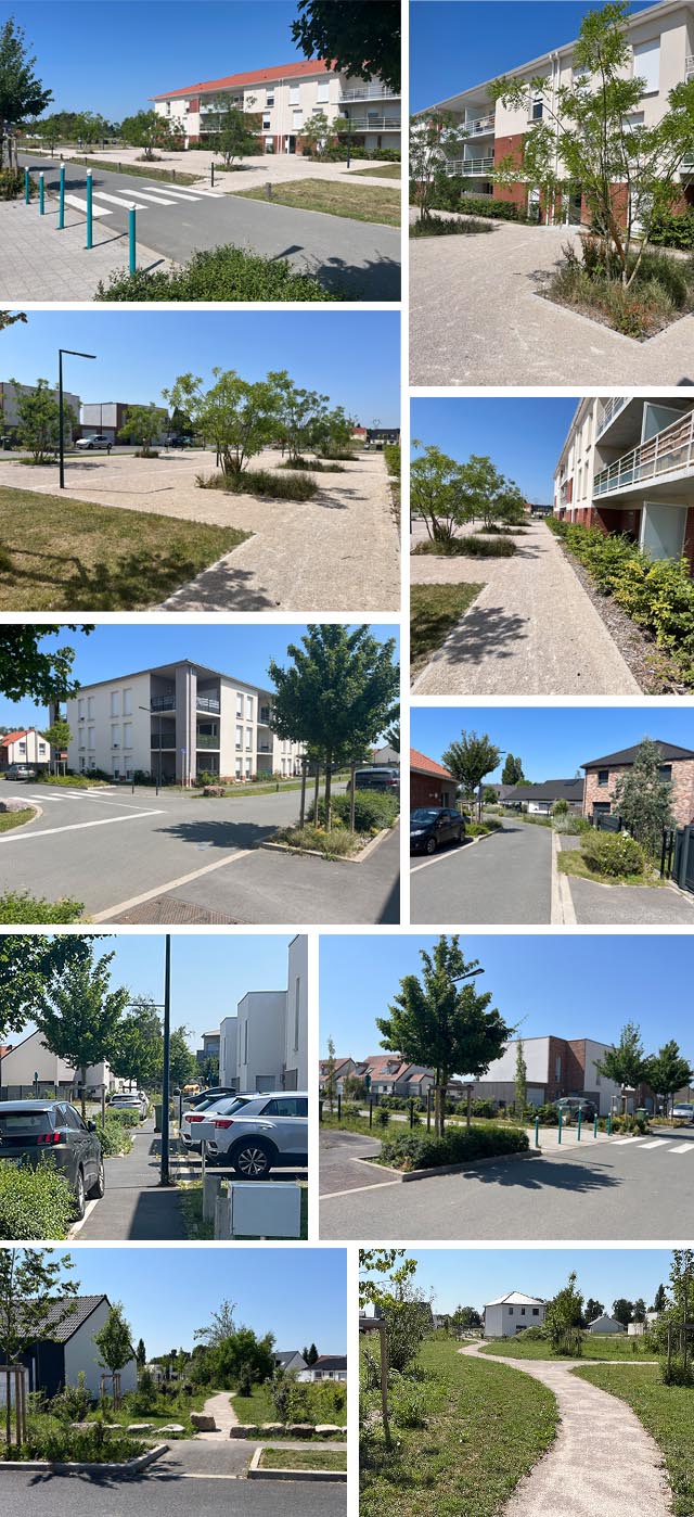Maisons de villes, semi collectifs, pavillons s’inscrivent dans un quartier verdoyant intégrant une dimension environnementale : gestion des eaux pluviales, exposition des parcelles, préservation des traces des chemins ruraux. Placettes piétonnes, liaisons douces et petits espaces verts favorisent l’ancrage du nouveau quartier et les échanges avec le reste de la commune.