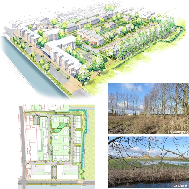 L’accent est mis sur un accompagnement paysager offrant une insertion optimale dans ce site de Flandres Maritime : intégration du watergang dans une coulée verte publique et création d’une mare, correspondant à 2 zones humides, desserte en voies partagées, mise en valeur du front urbain vers le Canal de la Colme.